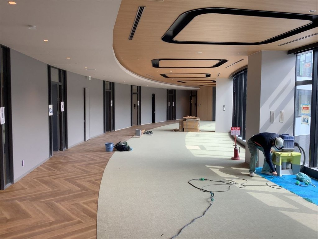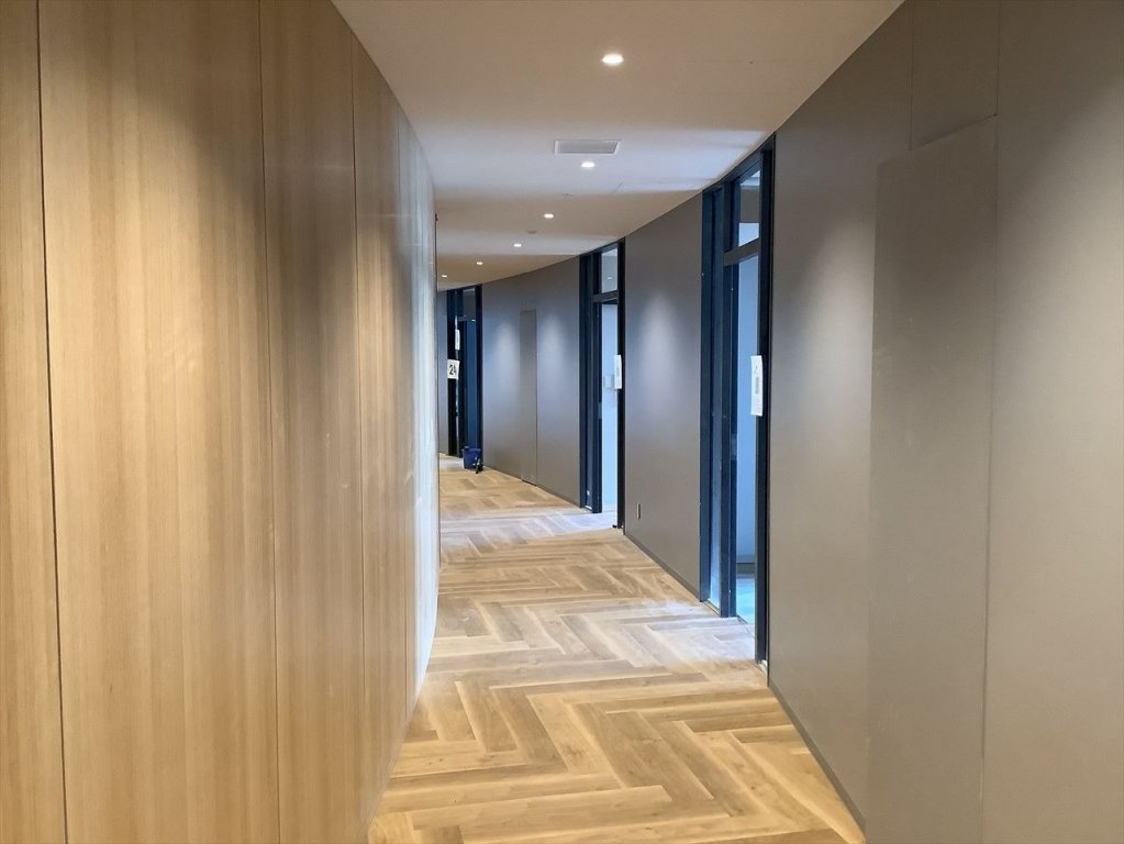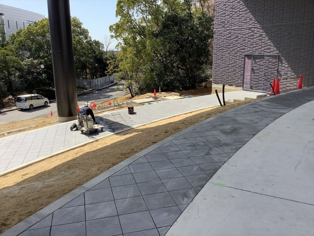 The installation of the glass eaves at the entrance is now complete. On the second floor, the walls and floor of the corridor are just about to be finished while in the lounge on the first floor, a louver has been installed in the indirect lighting section of the ceiling. Outside, the tiling of the stairs leading to the International House has begun.