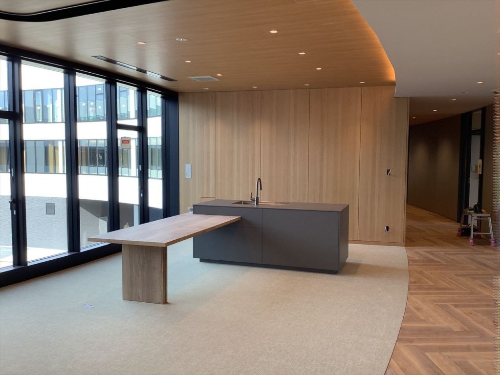Wall and floor finishes on the ground floor are in progress in various areas. The first photo shows the mailbox installation located at the back of the dining room.The island kitchen installed in the multi