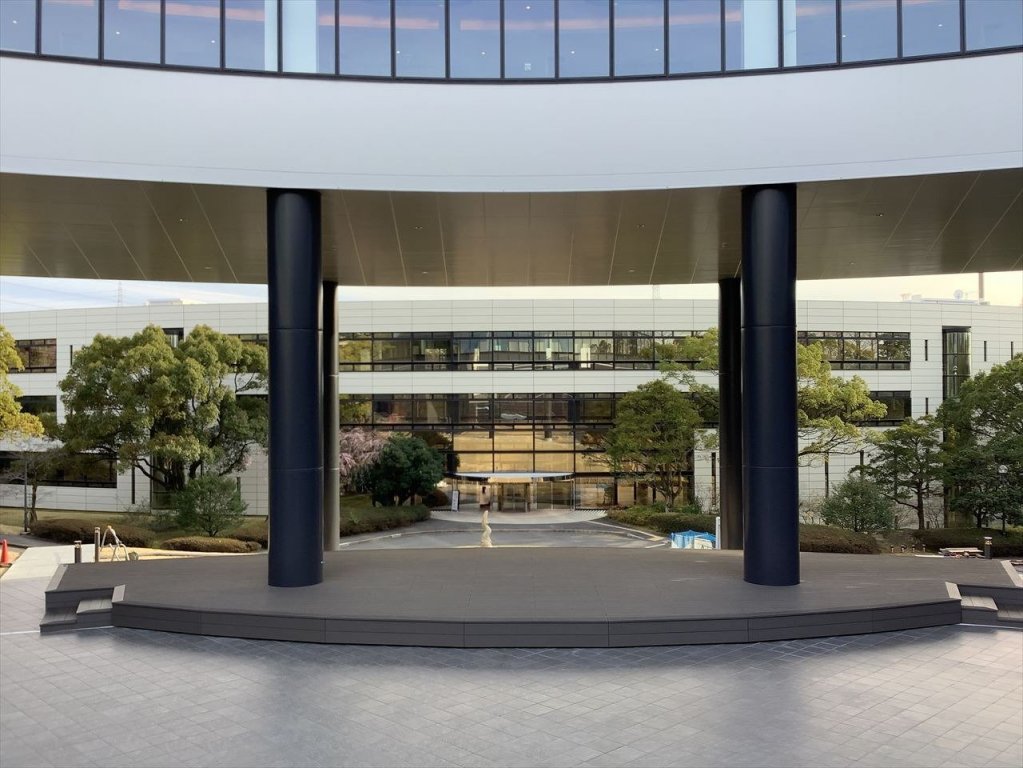 東側からの外観写真です。また、中庭のステージも出来上がりました。建物の東側の土の部分や西側では、これ