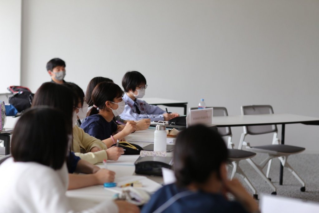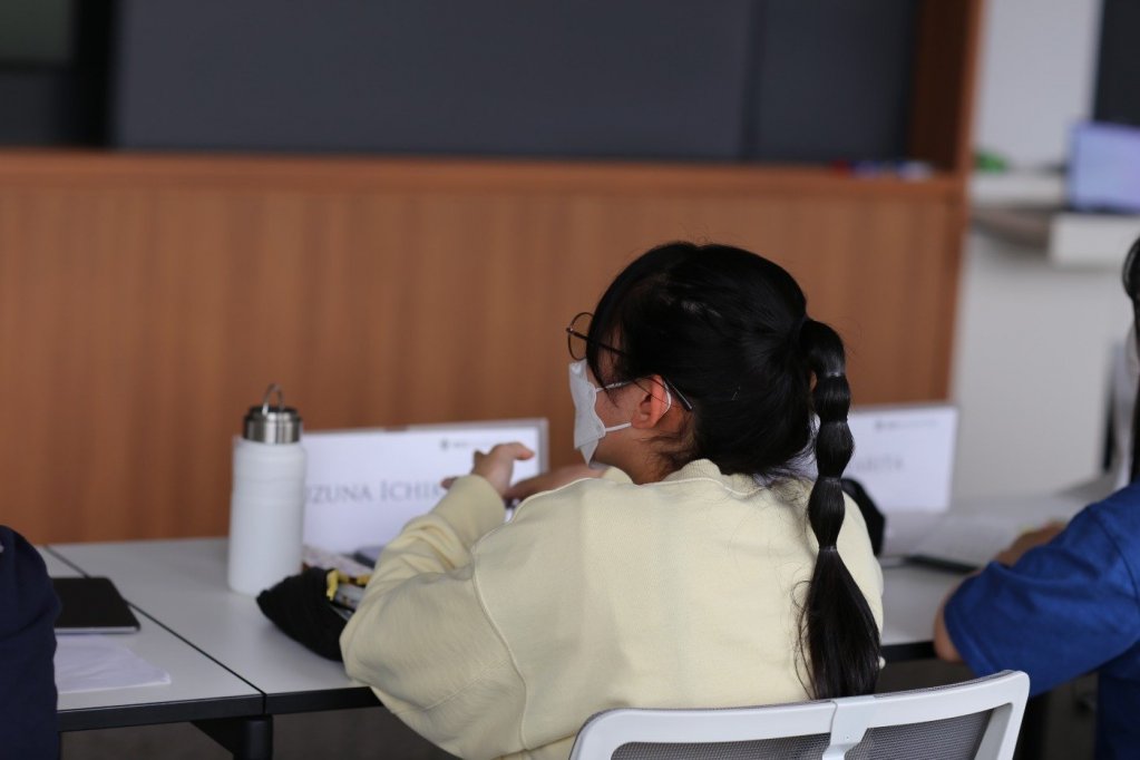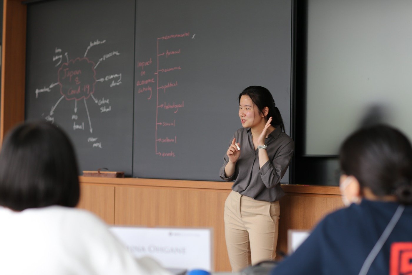 続けて、授業をご紹介します。Goh先生担当のによるビジネスマネジメントの授業です。名古屋商科大学をバックグラウンドにもつ国際高等学校ならではの授業と言ってもよいかもしれません。今回の授業では、Covid-19が経済活動にどのように影響したかを考えました。環境、金融、経済、政治、技術、社会、文化、スポーツイベントなどのカテゴリに分けて、それぞれどんな影響があるのかについて一つ一つについて、意見を出し合い、これらの影響が日本経済に有益/有害であったかどうかについて話し合いました。学生は、Covid-19のような「グローバルイベント」が国の経済をプラスとマイナスの両方で混乱させる可能性があること、そしてこれらの変化が市民の日常生活にどのように影響するかを考えました。ブリッジングプログラムが終わるまでには、学生は世の中に影響を与えるイベントが日常生活にどのように波及するかを説明できるよう考えを深めていきます。