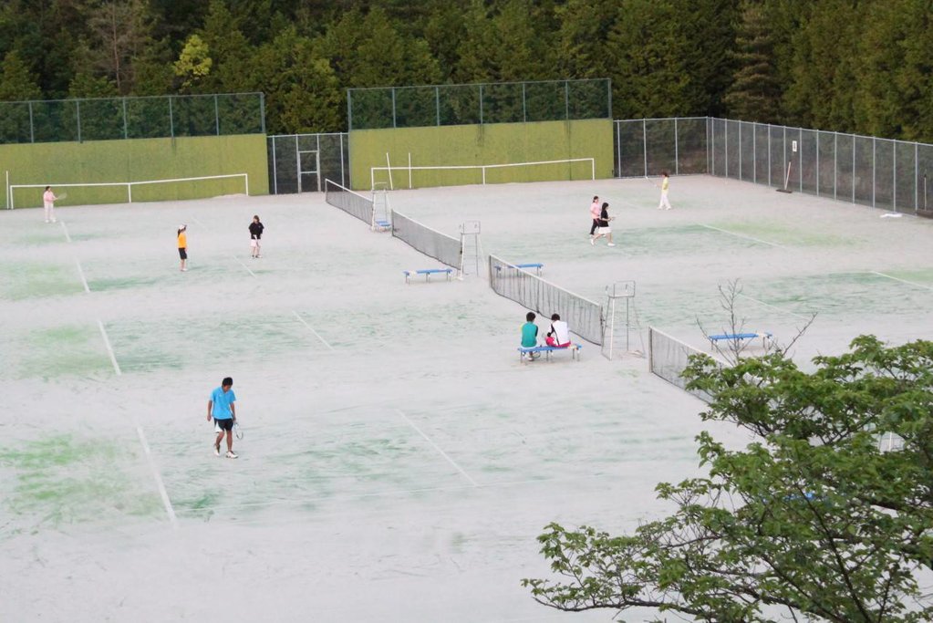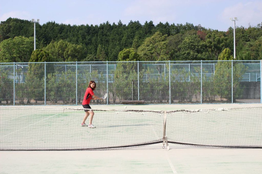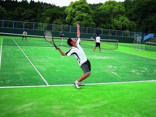 テニスコート テニスコートは、設置当初は全天候型ハードコート2面(スタンド付きメインコート)、クレーコート4面、他に練習用半コートでしたが、平成17年には全7面の人工芝テニスコート(オムニコート)に代わり、硬式テニス部、ソフトテニス部が練習に励んでおります。メインコートの東側には更衣室、シャワー室、トイレを備えたクラブハウスもあります。