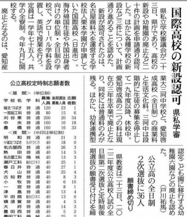 | 2022年3月24日 | 中日新聞 | 国際高等学校の新設認可 |