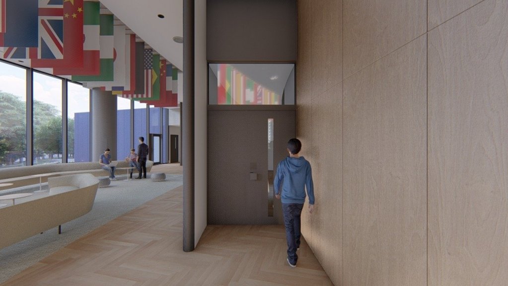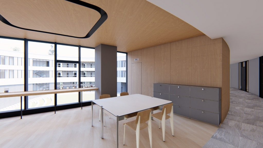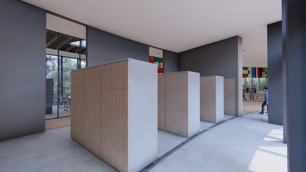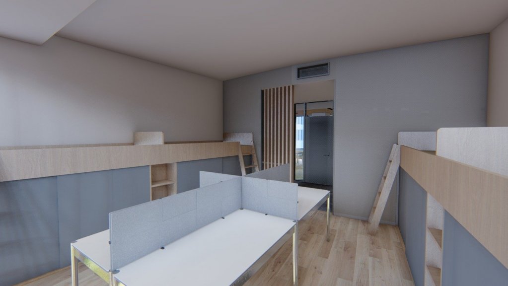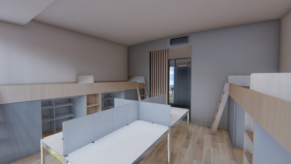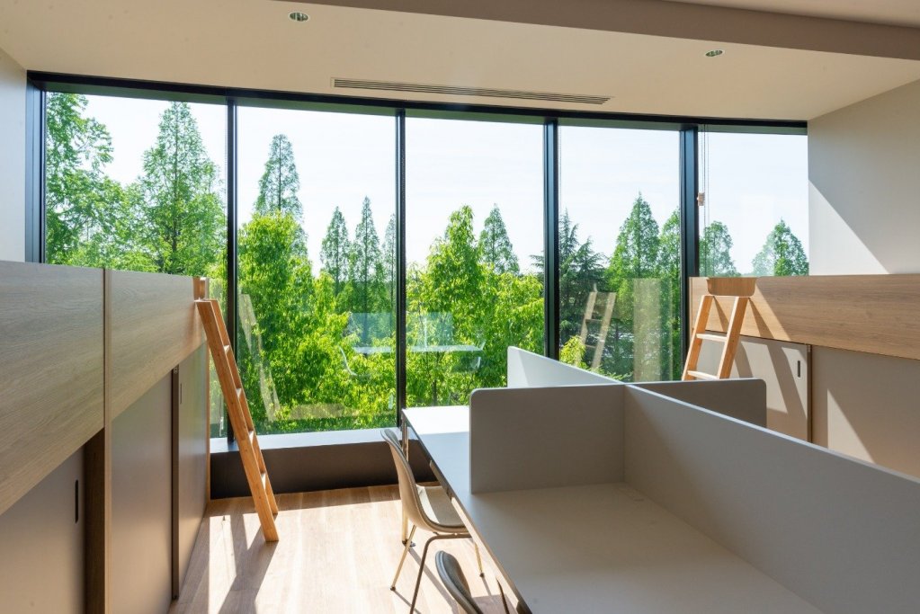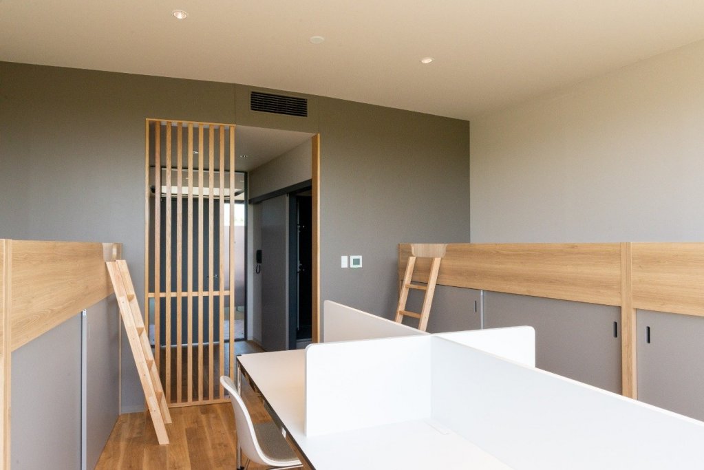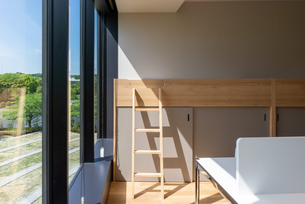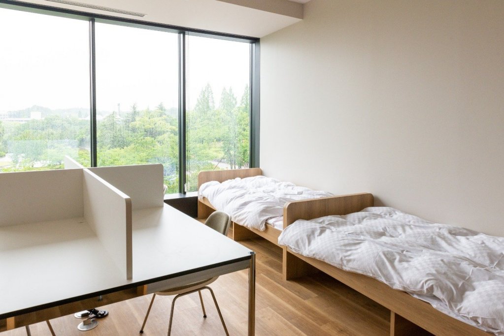 居室は男子・女子でフロアが分けられています。それぞれのフロアの入り口にセキュリティゲートが設置されており、男子は男子フロア(2F)のみ、女子は女子フロア(3F)のみ入室が可能です。寮室は4人1部屋となっており、室内にはベッド、収納スペース、学習机、シャワー室などが備え付けられています。また、フロアごとに共有スペースとしてのラウンジスペースが数か所用意されています。