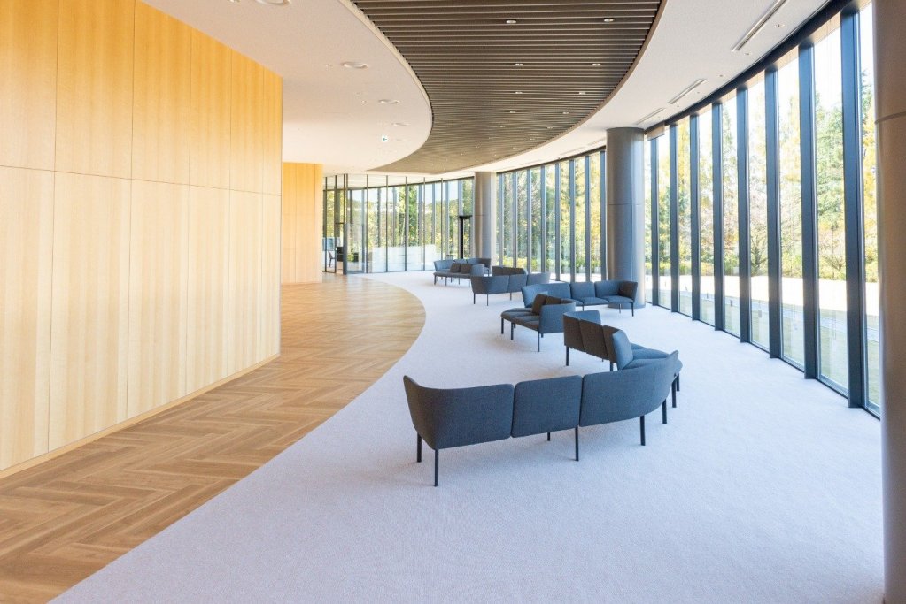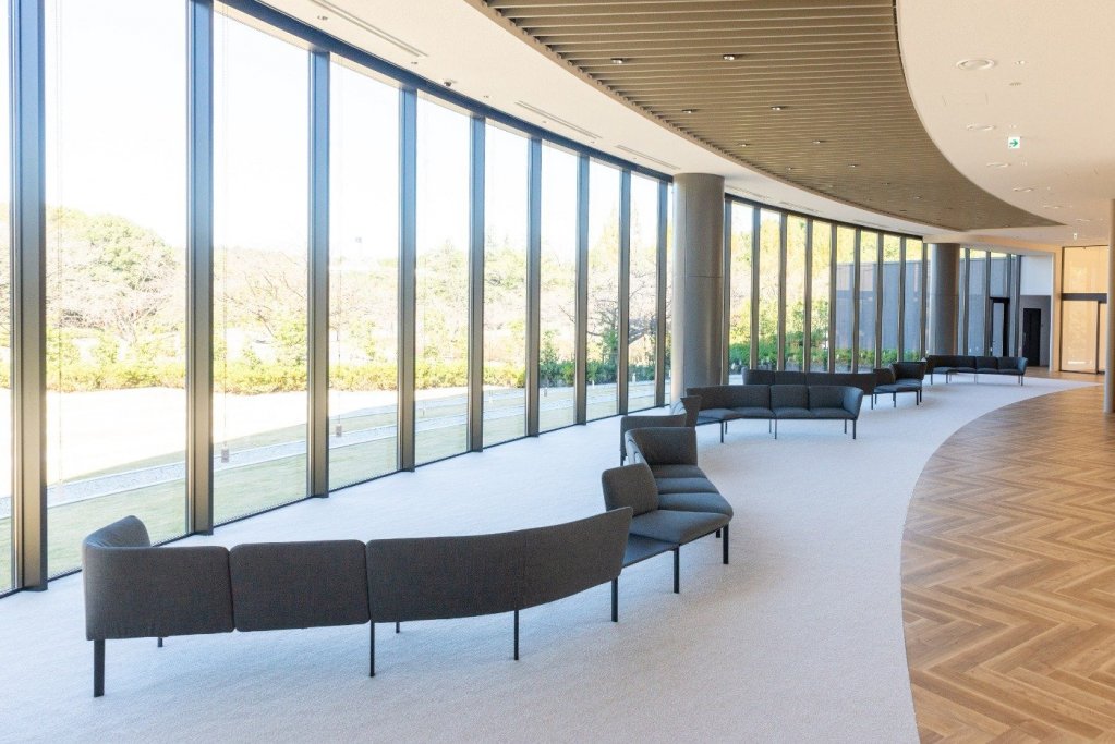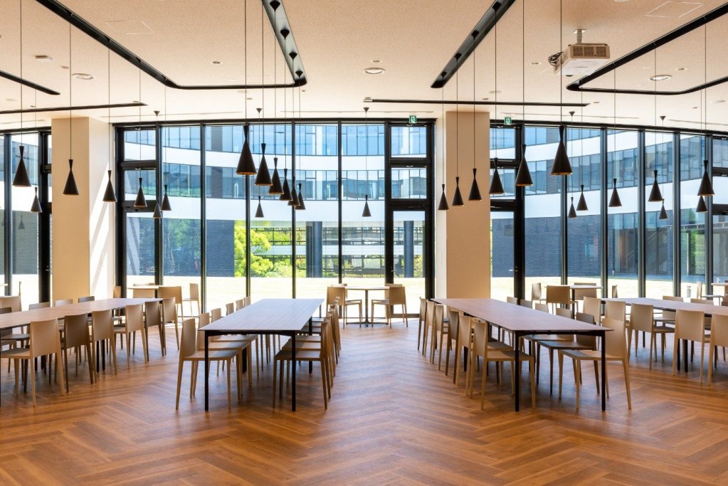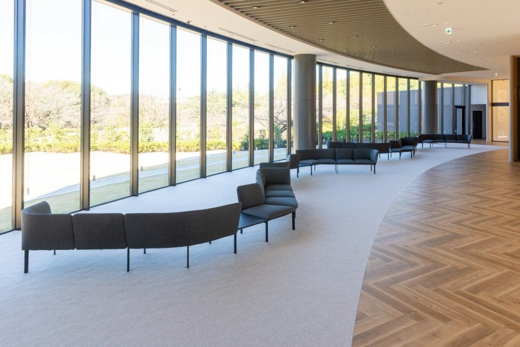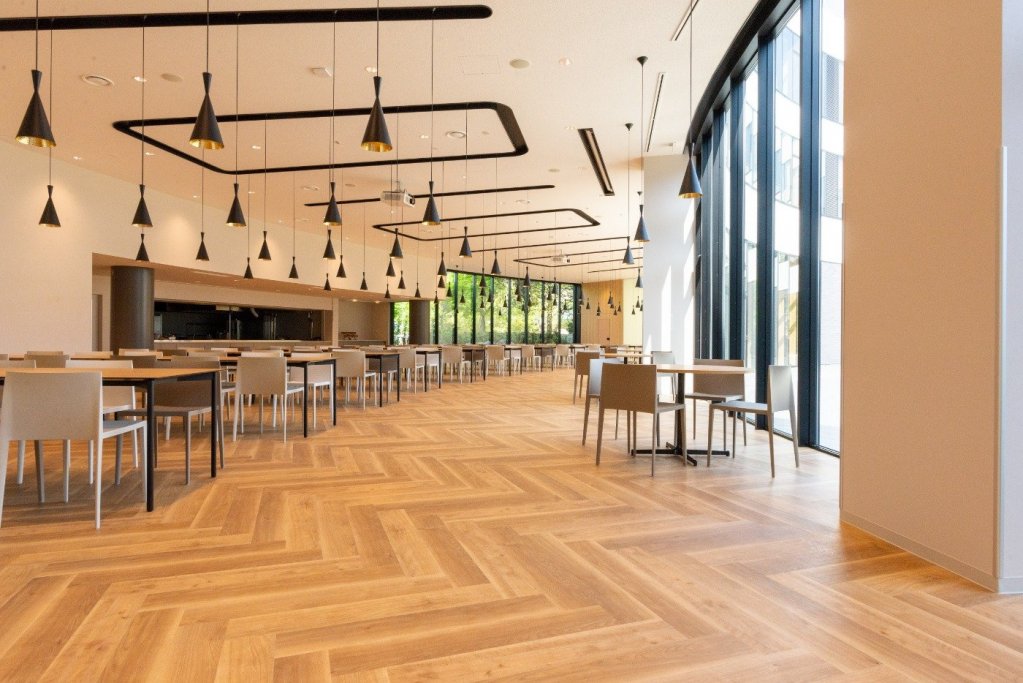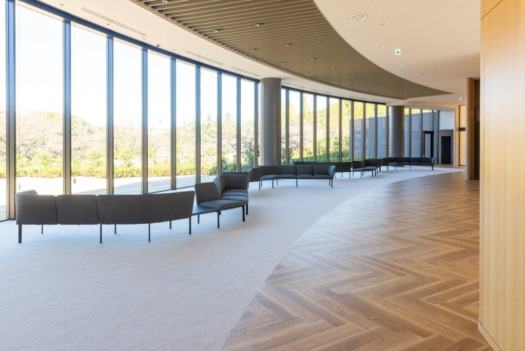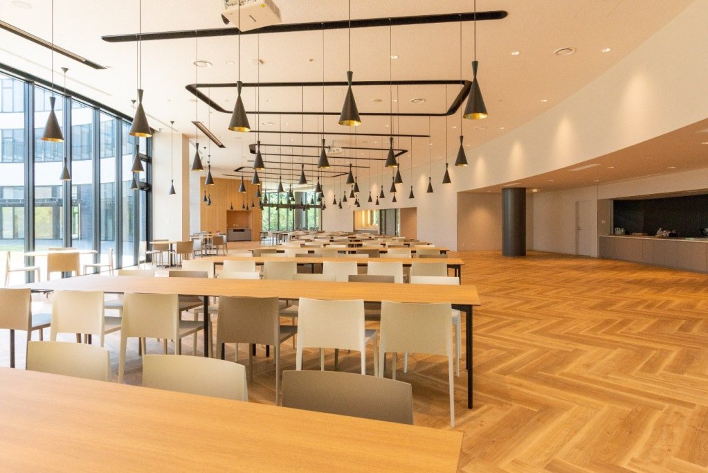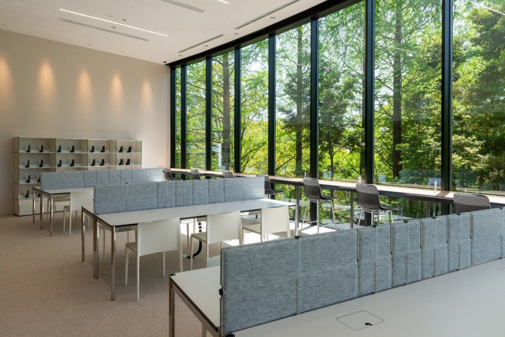 カフェテリアの前にはテラスが広がり、お天気のいい日はここで食事をとったり寛ぐこともできるスペースです。四季にあわせて植物も花を咲かせ、日本の四季の美しさを感じることができる憩いの場となるよう設計されています。
