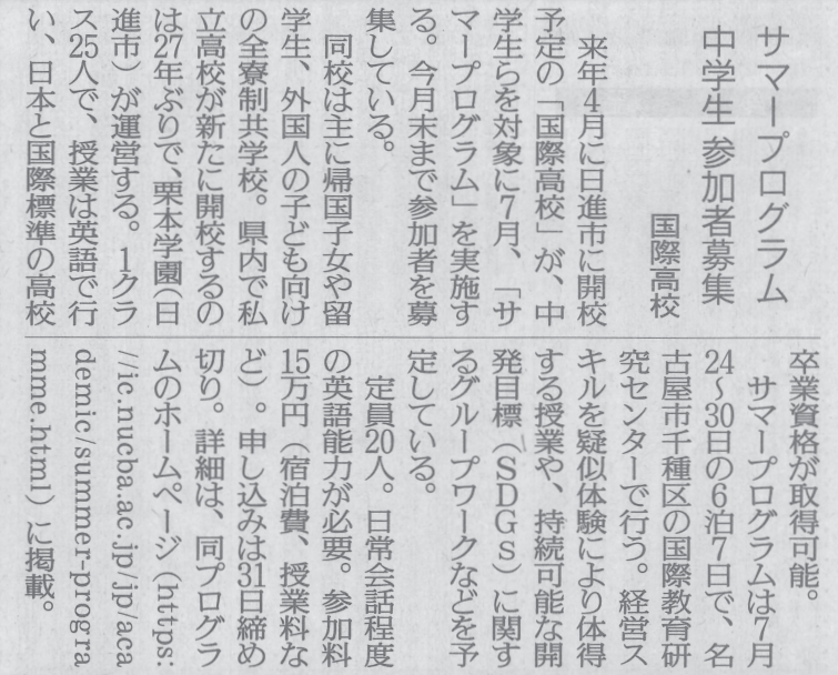 NUCB International College's Summer School was featured in the Chubu edition of the Yomiuri Shimbun.