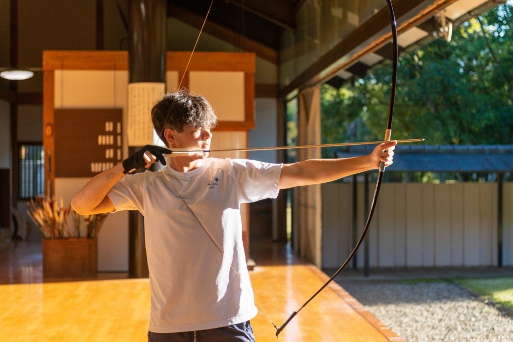 Asuka Naruse, an Ogasawara-style archer, was the instructor for the class, and the students have been practising under her full-scale instruction. All of the students started with no experience, but as the lessons progressed, they improved rapidly and are now able to powerfully shoot arrows up to the target at a distance of 28m.